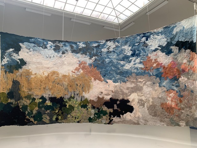Liefde voor textiel en in het bijzonder voor wol, vormt de rode draad in het werk van Claudy Jongstra (Roermond, 1963). Vanuit haar biodynamische boerderij en studio in Friesland werkt ze in volledige harmonie met haar omgeving. De kunstenaar gebruikt wol van Drentse heideschapen en past eeuwenoude technieken toe zoals vilten, kaarden, spinnen en weven. In de botanische tuin van de boerderij teelt haar partner Claudia Busson verfplanten waar ze haar werken mee kleurt.